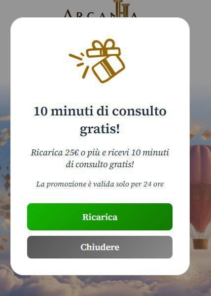 Arcanha Ti Regala 10 minuti se ricarichi almeno 25 euro dopo che finisci i tuoi 5 minuti gratuiti. Non sei ancora sicuro/a di come riscattare i 5 minuti gratuiti?